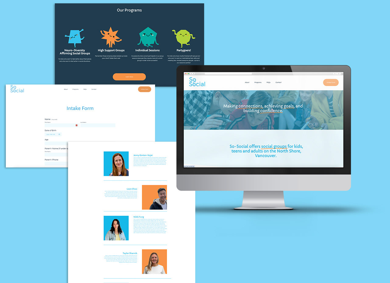 The So-Social team approached Pink Fern Design to develop a brand identity and website design that would communicate warmth, inclusivity, and professionalism to clients, parents, and referral sources. The goal was to create a visual system that felt friendly and welcoming for a wide range of ages—kids through adults—while also conveying trustworthiness and expertise in social skills development.